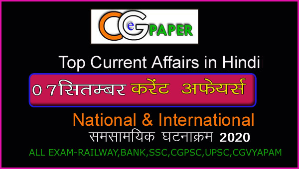 07 September 2020 daily current affairs in hindi मे most important टॉप Question Answer जो प्रतियोगी परीक्षाओं में पूछे जाते हैँ। Railway NTPC, Railway Group D, Banking, SSC, cgpsc, upsc Chhattisgarh Vyapam(Patwari, Data entry Operator, Chhatravash Adhikshak) की परीक्षाओं मे पुछे जाते है Daily Current Affairs केवल हिंदी भाषा मे है जो आपको तैयारी करने मे आसानी होगी ।