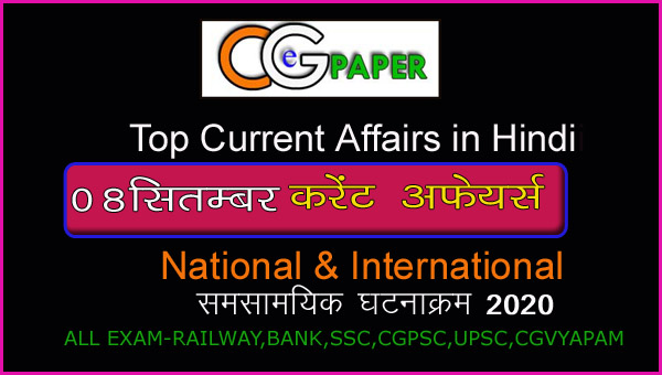 08 September 2020 daily current affairs in hindi मे most important टॉप Question Answer जो प्रतियोगी परीक्षाओं में पूछे जाते हैँ। Railway NTPC, Railway Group D, Banking, SSC, cgpsc, upsc Chhattisgarh Vyapam(Patwari, Data entry Operator, Chhatravash Adhikshak) की परीक्षाओं मे पुछे जाते है Daily Current Affairs केवल हिंदी भाषा मे है जो आपको तैयारी करने मे आसानी होगी ।