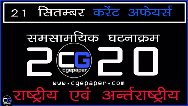 21 September 2020 Current Affairs in Hindi मे most important टॉप Question Answer जो प्रतियोगी परीक्षाओं में पूछे जाते हैँ। डेली करंट अफेयर्स रेलवे ग्रुप डी, रेलवे एनटीपीसी, बैंकिंग, एसएससी, छत्तीसगढ़ व्यापम, छत्तीसगढ़़ पीएससी आदि की परीक्षाओं मे पुछे जाते है Daily Current Affairs 2020 in hindi केवल हिंदी भाषा मे है आपको तैयारी करने मे आसानी होगी ।