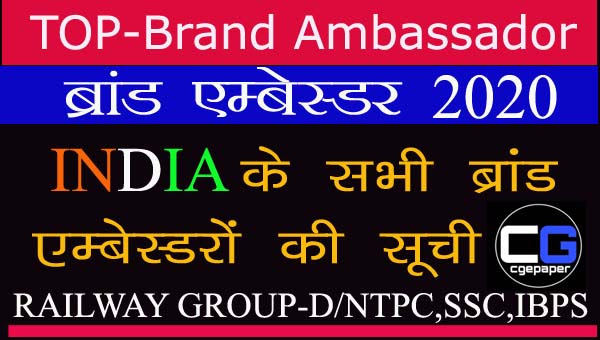 ब्रांड एम्बेसडर पूरी लिस्ट 2020: Brand Amessdor List 2020 in Hindi, ब्रांड एम्बेसडर क्विज रेलवे ग्रुप डी, एनटीपीसी, बैंकिंग, छत्तीसगढ़ व्यापम, छत्तीसगढ़ PSC,SSC यूपीएससी एग्जाम में Brand Ambassador Of India questions and answer पूछेेे जाते हैं।