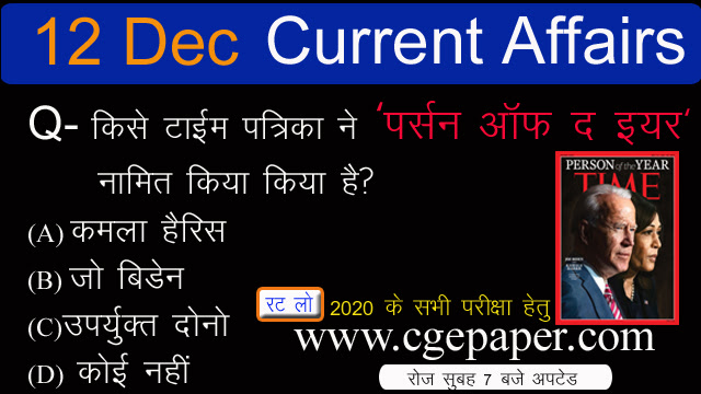 12 दिसंबर करंट अफेयर्स 2020 : december latest current current affairs 2020 in hindi, today current affairs quiz, आज के करंट अफेयर्स में आप जानेंगे रेलवे स्टेशन का नाम, एशियन ऑफ द ईयर , Perosn of the year 2020 से सम्बंधित है ।