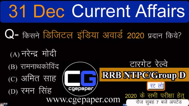 daily latest current affairs 31 December 2020 Current Affairs Hindi, आज के इस latest current affairs में जानेगे कि राष्ट्रीय एवं अंतर्राष्ट्रीय समसामयिक घटनाक्रम के बारे में बताएं गया है जो की Railway NTPC, Railway Group D Exam के एग्जाम Paper मेंं daily latest current affairs for GK 2021 all exam paper से संबंधित प्रश्न पूछे जाते हैं।